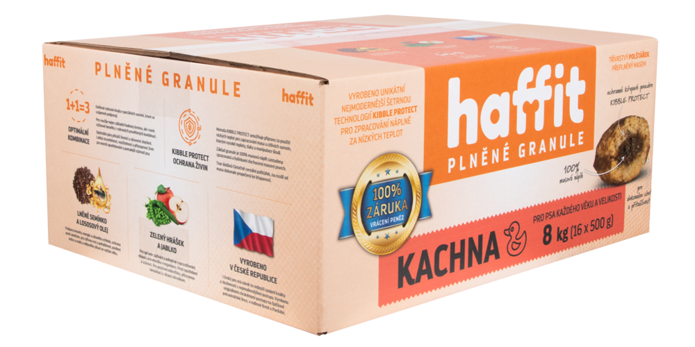 Pro plněné granule HAFFIT je typická chutnost a mimořádně vysoká využitelnost i kompletnost živin. Základem jsou vybrané kvalitní suroviny, převážně živočišné. Unikátní je zpracování technologií KIBBLE PROTECT do třívrstvého polštářku. Hlavní součást granule (66 %) je masová náplň zpracovaná za nižších teplot, aby se horkem nenarušila hodnota a využitelnost živin. Maso je ochráněno dobře propečenou křupavou vrstvou a opatřeno vrchní vrstvičkou s bylinkami. KIBBLE PROTECT – ochrana živin.
