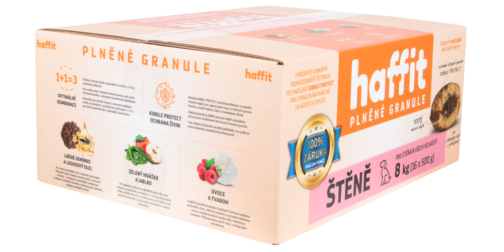 Pro plněné granule HAFFIT je typická chutnost a mimořádně vysoká využitelnost i kompletnost živin. Základem jsou vybrané kvalitní suroviny, převážně živočišné. Unikátní je zpracování technologií KIBBLE PROTECT do třívrstvého polštářku. Hlavní součást granule (66 %) je masová náplň zpracovaná za nižších teplot, aby se horkem nenarušila hodnota a využitelnost živin . Maso je ochráněno dobře propečenou křupavou vrstvou a opatřeno vrchní vrstvičkou s bylinkami. KIBBLE PROTECT – ochrana živin.