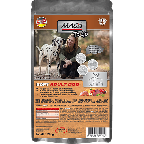 Kompletní měkké polovlhké granulované krmivo pro dospělé psy. Ve variantě "to go" 230 g vhodné jako pamlsek.